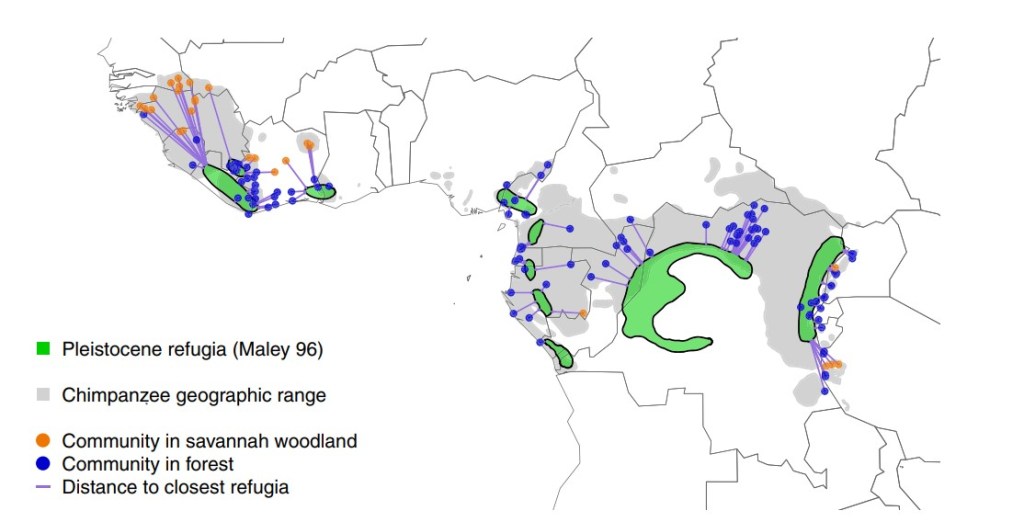 In conclusion, chimpanzees exhibit a greater behavioural diversity in environments with more variability. Distance from Pleistocene forest refugia was associated with a larger number of behavioural traits, including both tool and non-tool use behaviours.